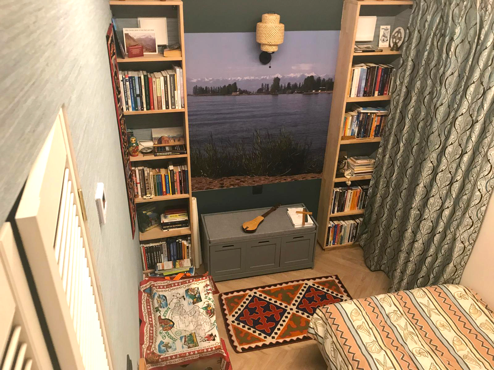 Mijn werkmeubel paste in de brede doorgang van woon- naar de slaapkamer. Ik houd erg van boeken en ik heb de nodige souvenirs van mijn tijd in het buitenland. Die heb ik samengebracht in de slaapkamer met als thema Centraal Azië. Fotoalbums in een opbergbank, boeken in ondiepe boekenkasten in de hoeken met fotobehang ertussen en wandkleedjes aan de muur. Aan de andere kant kreeg de woonkamer een lokaal thema – de Biesbosch, onze natuur om de hoek. Dat moest terugkomen in aardse kleuren, zoals tinten groen en beige op de muur, een blauw vloerkleed en turquoise gordijnen.